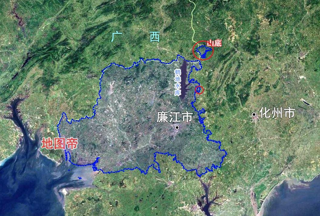 湛江市位于雷州半岛,和海南省隔海相望,东北和广东茂名市相接,西北和广西玉林市相连。廉江市是湛江市最北的市,这两块飞地就是廉江市治下的几个村子,这里是廉江市也是湛江最北的地方。