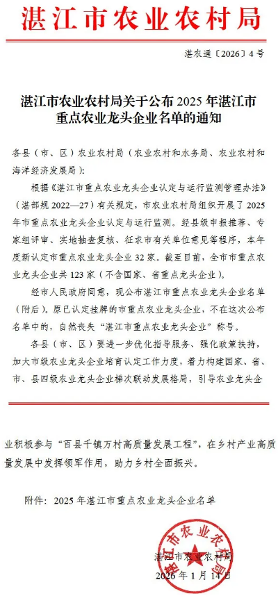 近日,湛江市农业农村局发布了关于公布2025年湛江市重点农业龙头企业名单的通知。